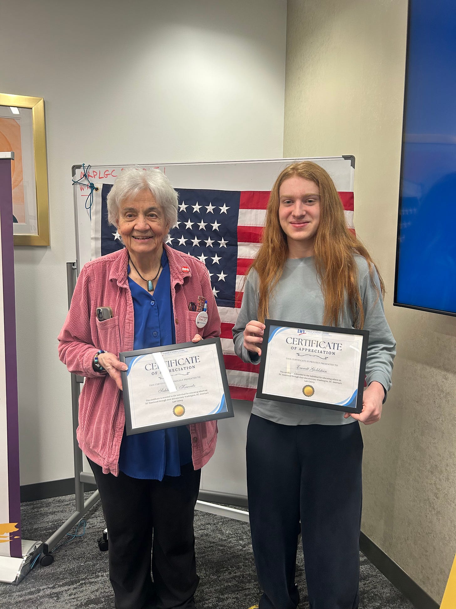 During LWVDC’s recent Lunch & Learn about D.C. Statehood, our full house enjoyed screening the documentary created by Everett Goldstein and Siddarth Kravetz for the C-SPAN StudentCam Contest. Goldstein and Kravetz are students at Duke Ellington School of the Arts in Washington, D.C. C-SPAN’s theme for its 2026 StudentCam documentary competition is “America’s 250th Anniversary; Exploring the American Story through the Declaration of Independence.” The students chose to focus their documentary on D.C. Statehood. Everett Goldstein was able to join the meeting, spoke about how they developed the film, titled “Washington, DC: America’s Last Colony,” and accepted certificates of appreciation for their work from Anne Anderson, Chair of the Committee for Full Rights for D.C. Citizens. (Please note the 51-star flag!)